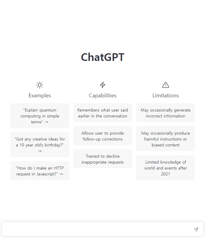 하지만 인터넷에서 자료를 수집하여 학습한 인공지능이라는 점에서 모든 답변이 정확한 답변이 아니며, 2021년 이전까지의 데이터만 학습을 했다는 점에서 2022년 이후 나온 개념 등에 제대로 된 답변을 받을 수 없다는 점이 한계점입니다