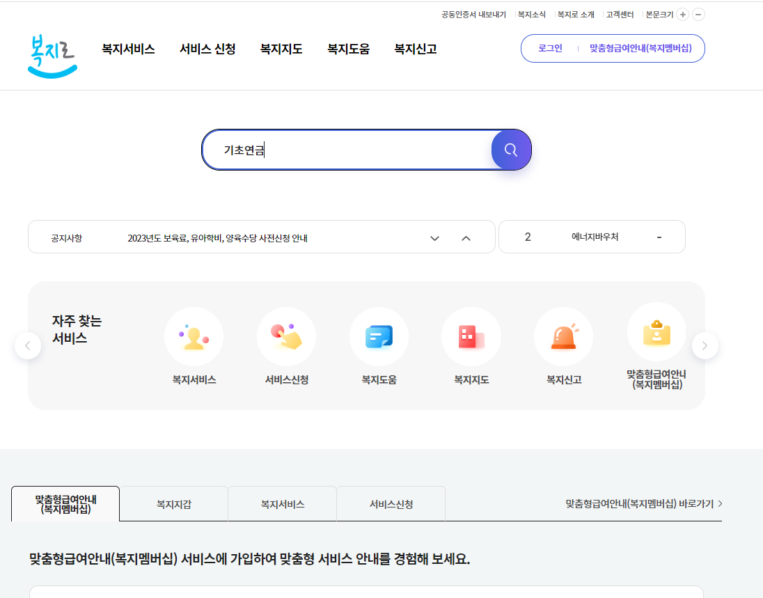2. 위 사진 처럼 메인 검색창에 '기초연금'을 검색합니다