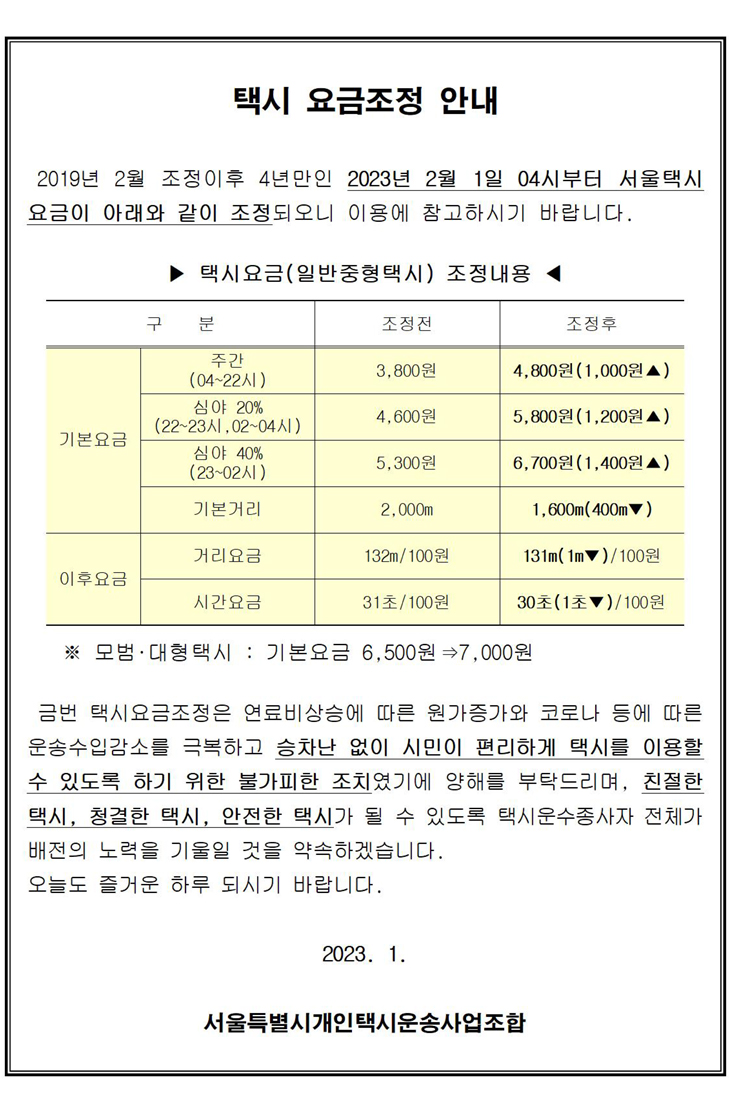 2023년 2월 1일 부로 기존 3,800원 이던 택시기본 요금이 4,800으로 1천원 인상되었습니다.